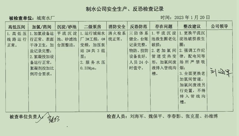 城南水廠2023年1月安全生產(chǎn)檢查記錄