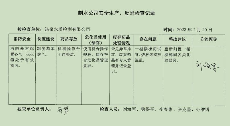 湯泉水質(zhì)檢測中心2023年1月安全生產(chǎn)檢查記錄