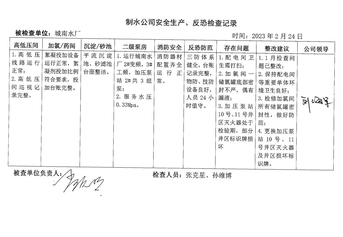 城南水廠2023年2月安全生產(chǎn)檢查記錄