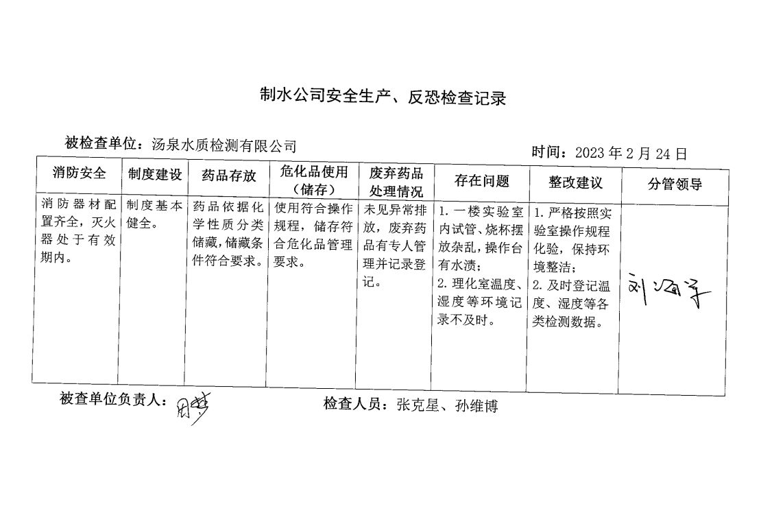 湯泉水質(zhì)檢測(cè)中心2023年2月安全生產(chǎn)檢查記錄
