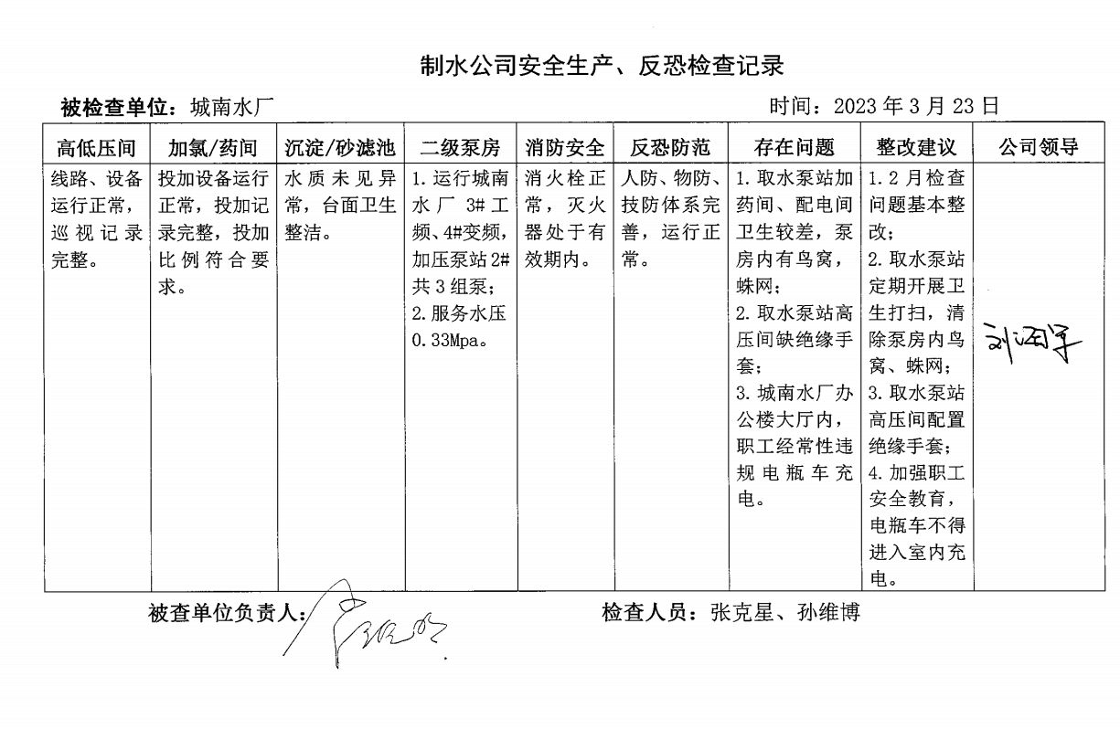 城南水廠2023年3月安全生產檢查記錄