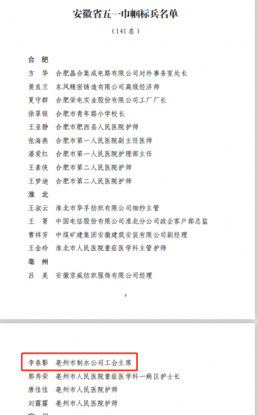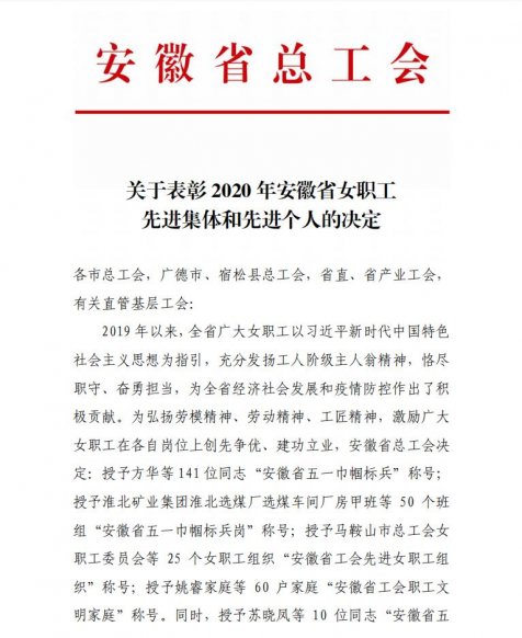 近日,安徽省總工會(huì)下發(fā)了《關(guān)于表彰2020年安徽省女職工先進(jìn)集體和先進(jìn)個(gè)人的決定》,授予全省141位女職工“安徽省五一巾幗標(biāo)兵”稱號(hào),市制水公司工會(huì)主席李春影榮獲省“五一巾幗標(biāo)兵”稱號(hào)。