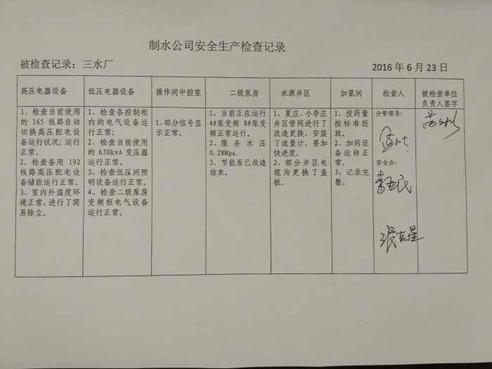 三水廠2016年6月安全生產(chǎn)檢查記錄