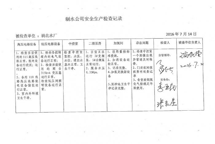 渦北水廠2016年7月安全生產(chǎn)檢查記錄