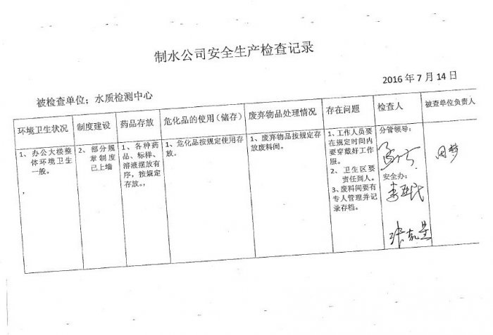 水質(zhì)檢測中心2016年7月安全生產(chǎn)檢查記錄