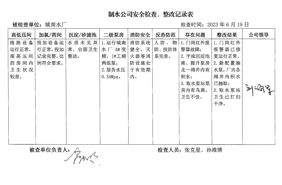 城南水廠2023年6月安全生產(chǎn)檢查記錄