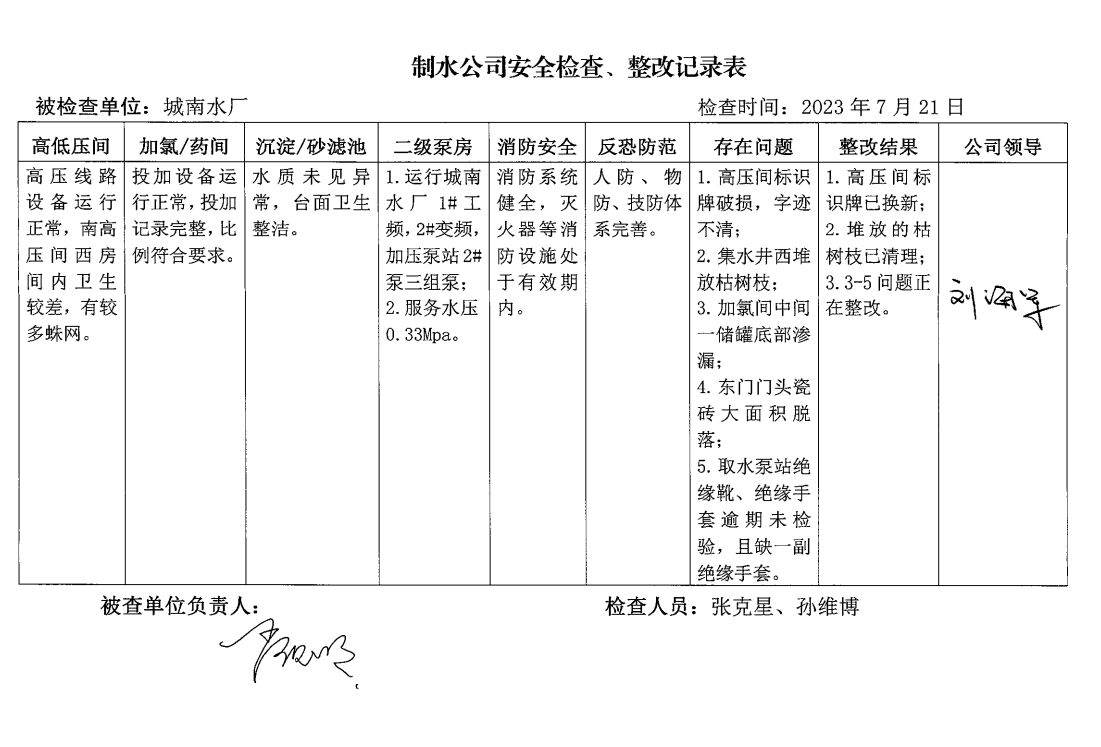 城南水廠2023年7月安全生產(chǎn)檢查記錄