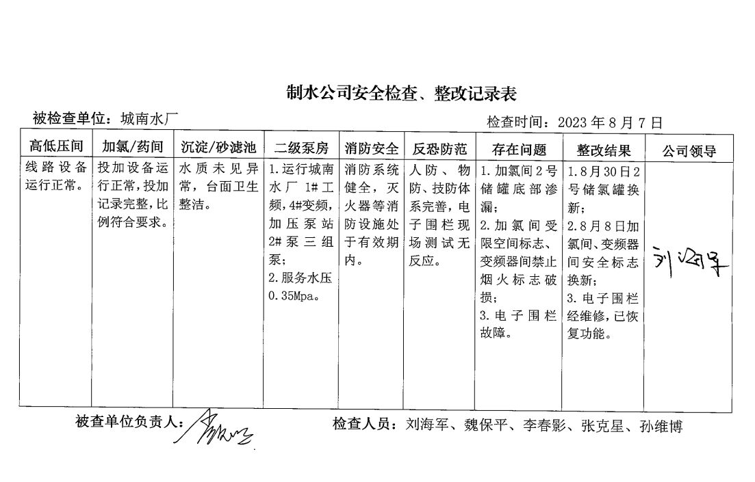 城南水廠2023年8月安全生產(chǎn)檢查記錄