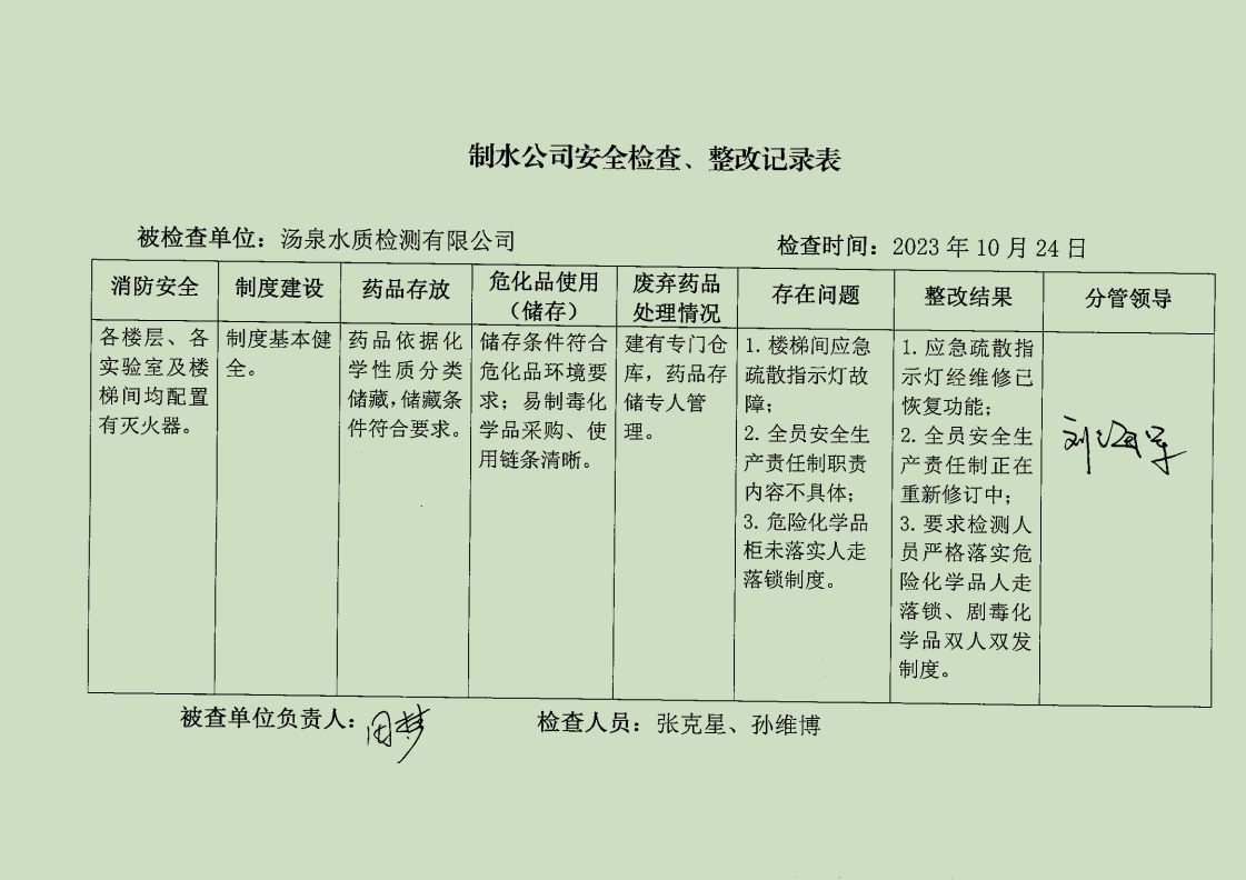 湯泉水質(zhì)檢測(cè)中心2023年10月安全生產(chǎn)檢查記錄