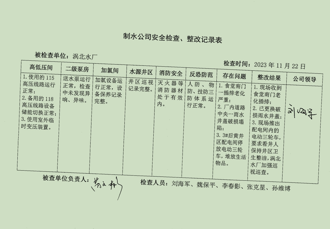 渦北水廠2023年11月安全生產(chǎn)檢查記錄