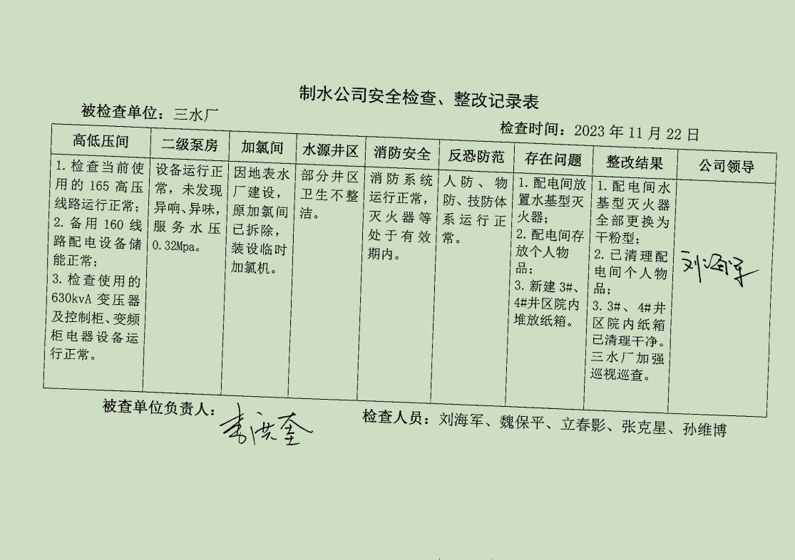 三水廠2023年11月安全生產(chǎn)檢查記錄