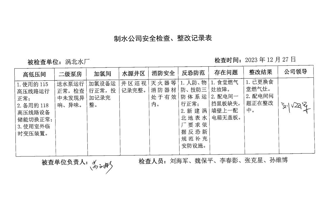 渦北水廠2023年12月安全生產(chǎn)檢查記錄
