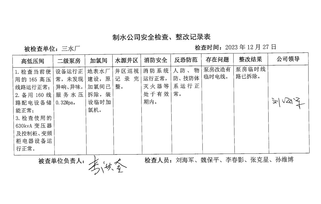 三水廠2023年12月安全生產(chǎn)檢查記錄