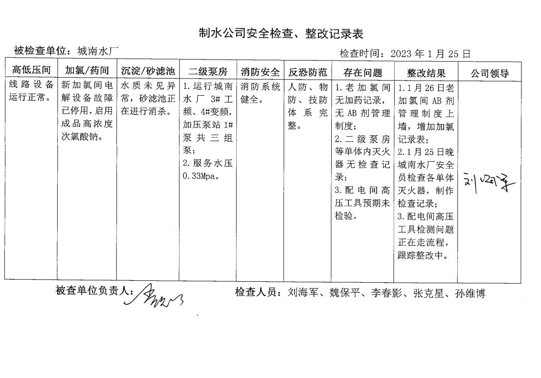 城南水廠2024年1月安全生產(chǎn)檢查記錄